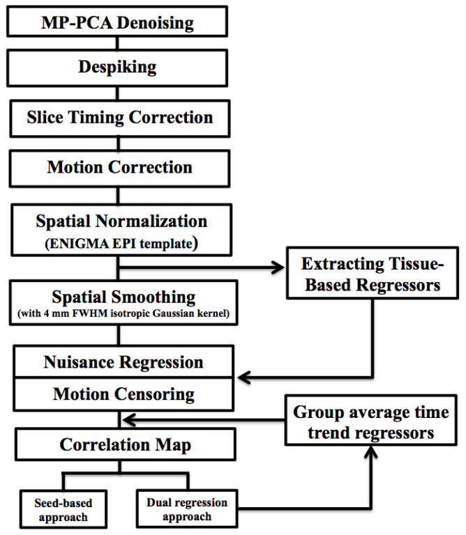 Preprocessing: Following the ENIGMA analysis pipeline for resting-state fMRI data implemented in the AFNI software (Fig. 1) (Adhikari et al, 2018), we will first apply Marchenko-Pastur distribution-based principal components analysis (MP-PCA) for denoising (Veraart et al, 2016), to improve signal-to noise ratio (SNR) and temporal SNR (tSNR) properties of the time series data, with no loss of spatial resolution of the image and without the introduction of additional partial volume effects. We will then correct spatial distortions associated with long-TE gradient echo imaging using the gradient- echo ‘fieldmap’ or the reversed-gradient approach. After that, we will correct the time of acquisition of each slice. Next, we will correct head motion by registering each functional volume to the volume with the minimum outlier fraction, where each transformation is concatenated with the transformation to standard space, to avoid unnecessary interpolation. We will further spatially normalize images to the ENIGMA EPI template in Montreal Neurological Institute (MNI) standard space for group analysis, and then smooth the images with a 4-mm kernel. We will then regress out the effects of nuisance variables such as the linear trend, 6 motion parameters (3 rotational and 3 translational directions), their 6 temporal derivatives (rate of change in rotational and translational motion) and time courses from the local white matter and cerebrospinal fluid (CSF) from lateral ventricles. Finally, we will censor the time points with excessive motion (> 0.2 mm) estimated as the magnitude of displacement from one time point to the next, including neighboring time points and outlier voxels fraction (>0.1) were censored from statistical analysis. We will make outlier images based on the time points with excessive motion, and enter then into the individual-level general linear model to remove the influence of these time points on estimates of functional connectivity while maintaining the temporal structure of the data.