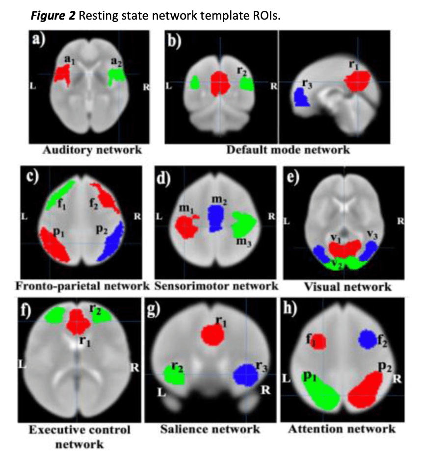 The resting state network template ROI are the same as in Adhikari et al., 2018. The brain regions [Sv1] in the different networks are: a) a1, left primary auditory cortex, a2, right primary auditory cortex b) r1, posterior cingulate cortex, r2, angular gyrus 3, medial prefrontal cortex c) f1, left lateral prefrontal cortex, f2, right lateral prefrontal cortex, p1, left posterior parietal cortex, p2, right posterior parietal cortex d) m1, left postcentral gyrus, m2, supplementary motor area, m3, right postcentral gyrus e) v1, v2, v3, visual areas f) r1, anterior cingulate cortex, r2, dorsolateral prefrontal cortex g) r1, dorsal anterior cingulate cortex, r2, left insula, r3, right insula h) f1, left middle/inferior frontal gyrus, f2, right middle/inferior frontal gyrus, p1, left inferior parietal lobe, p2, right inferior parietal lobe