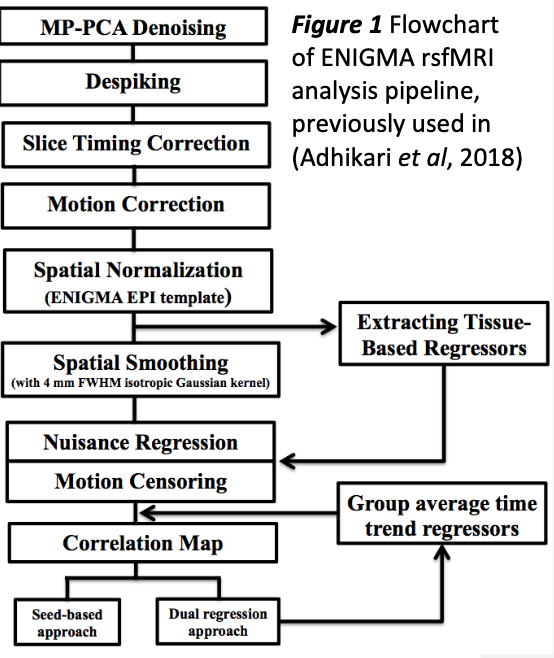 Resting state data from the different cohorts will be analyzed centrally using the ENIGMA resting-state pipeline (Figure 1; (Adhikari et al, 2018)). First, Marchenko-Pastur distribution-based principal components analysis (MP-PCA) will be applied for denoising (Veraart et al, 2016). This will improve signal-to noise ratio (SNR) and temporal SNR (tSNR) properties of the time series data without loss of spatial resolution of the image and the introduction of additional partial volume effects. Then spatial distortions associated with long-TE gradient echo imaging will be corrected using the gradient- echo ‘fieldmap’ or the reversed-gradient approach. Subsequently, the time of acquisition of each slice will be corrected. Furthermore, each functional volume will be registered to the volume with the minimum outlier fraction to correct for head motion, where each transformation is concatenated with the transformation to standard space to avoid unnecessary interpolation. Images will be spatially normalized to the ENIGMA EPI template in Montreal Neurological Institute (MNI) standard space for group analysis, and then smoothed with a 4-mm kernel. The effects of nuisance variables such as the linear trend, 6 motion parameters (3 rotational and 3 translational directions), their 6 temporal derivatives (rate of change in rotational and translational motion) and time courses from the local white matter and cerebrospinal fluid (CSF) from lateral ventricles will be regressed out. Finally, the time points with excessive motion (> 0.2 mm) estimated as the magnitude of displacement from one time point to the next, including neighboring time points and outlier voxels fraction (>0.1), will be censored from statistical analysis. Outlier images will be created based on the time points with excessive motion, and entered into the individual-level general linear model to remove the influence of these time points on estimates of functional connectivity while maintaining the temporal structure of the data. For more details (Adhikari et al, 2018).