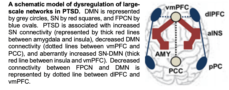 Large-Scale ICNs in Trauma-related Psychopathology Resting state functional connectivity (rsFC) analyses have identified multiple large-scale intrinsic connectivity networks (ICNs), that correspond to task-related connectivity patterns8,9. Over the past 5-7 years, several research groups, including ours, have reported ICN seed-based studies showing individuals with PTSD have hyper-connectivity within the nodes of Salience Network (SN) linked to detection of threat, salience and integration of interoceptive, and emotional information, like insula, dorsal anterior cingulate (dACC) and in some models, amygdala10-13, Several seed-based studies have also reported decreased within-network connectivity in the “task-negative” Default Mode Network (DMN, linked to self-referential processing, autobiographical memory, and “mind wandering”: posterior cingulate cortex (PCC), ventral medial PFC (vmPFC) / subgenual PFC (sgPFC), and hippocampus12-17 .Finally, PTSD has been associated with aberrantly increased DMN-SN (e.g. DMN-amygdala and insula) cross-network connectivity i.e. network desegregation12,15,18. We have previously hypothesized increased DMN-SN connectivity at rest as potentially underlying PTSD hyperarousal symptoms, associated with intrusive, automatic distress reactions to both external cues and internal physiological states.