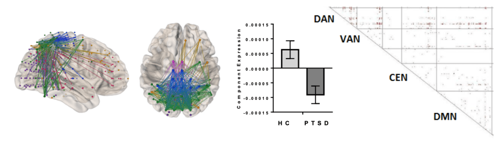 Connectomic Analysis reveals PTSD associated with altered expression of a connectivity component comprised of negative connectivity (segregation) between DMN, DAN, and VAN.