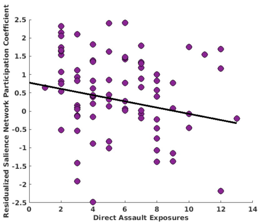 Figure 3: Participation coefficient of the Salience Network is inversely related to number of direct assault exposures in the PTSD group at a trend level (t(80) =-1.89, p = .06)